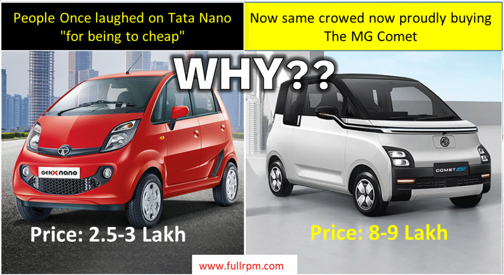 Furthermore, the technological offerings of the two vehicles differ vastly. The Nano was basic and focused on cost-cutting, lacking modern features, whereas the Comet boasts advanced connectivity, digital dashboards, touchscreens, and AI-enabled controls, appealing to tech-savvy urban buyers. The value perception has also evolved; while the Nano was seen as “cheap, low status” at ₹2.5L – ₹3L, the Comet at ₹8L – ₹9L is perceived as “premium, futuristic,” as people are willing to pay more for innovation and sustainability.